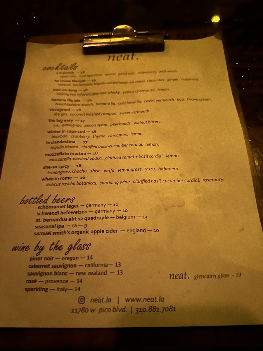 Introducing the menu at neat. - Los Angeles, a hidden gem at 11780 W Pico Blvd that perfectly balances a cozy atmosphere with an extensive drinks selection. This cocktail bar offers an impressive array of bottled beers, such as Schonramer Lager and Samuel Smith's Organic Apple Cider, alongside expertly curated wines like Pinot Noir and Sauvignon Blanc.